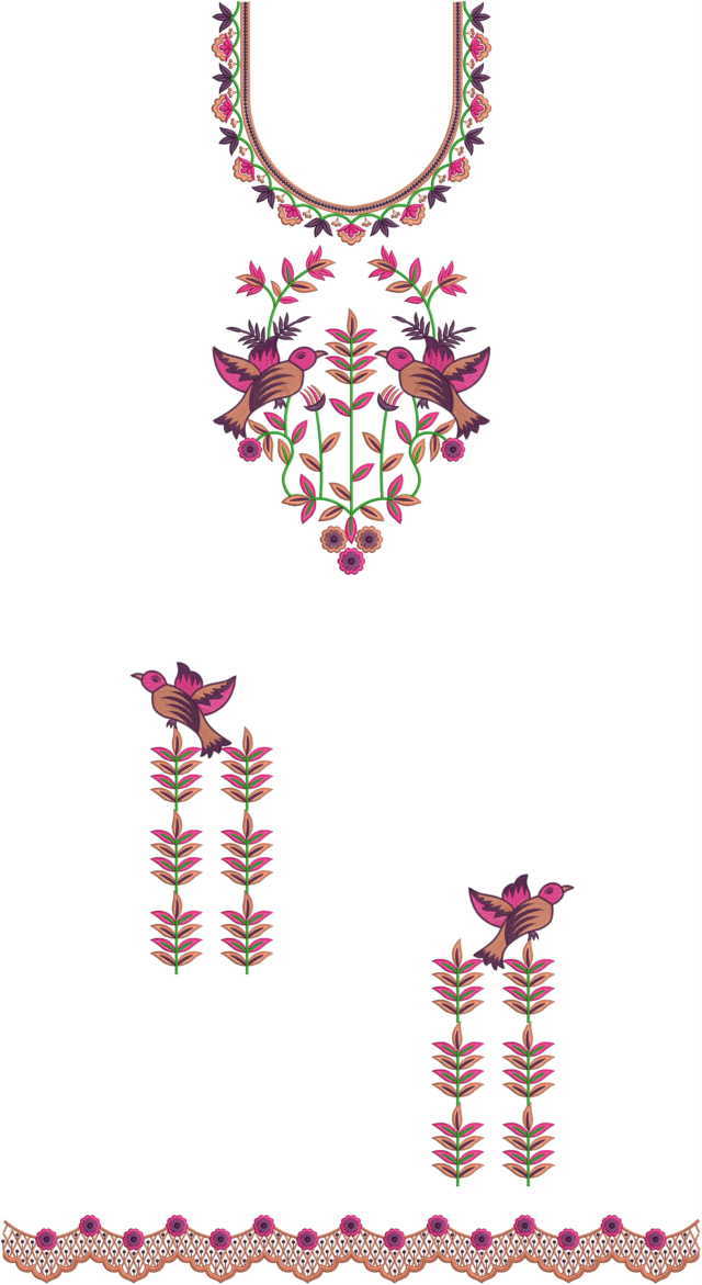 Small leaf sparrow figure concept Neck butti lace Single head Top & Duppata Embroidery Design