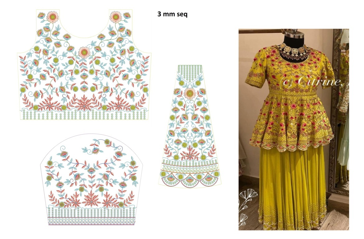 3 mm seq flowers concept Anarkali readymade suit/duptta embroidery design