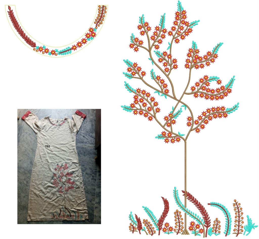 Creative tree figure neck concept kurti embroidery design